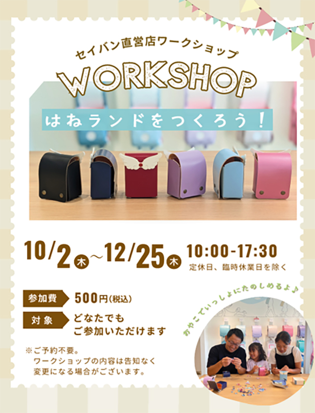 ランドセルの端材でできた小さなランドセルを組み立て、お好みでパーツシールを貼り、「世界にひとつだけのミニランドセル」をおつくりいただけます。