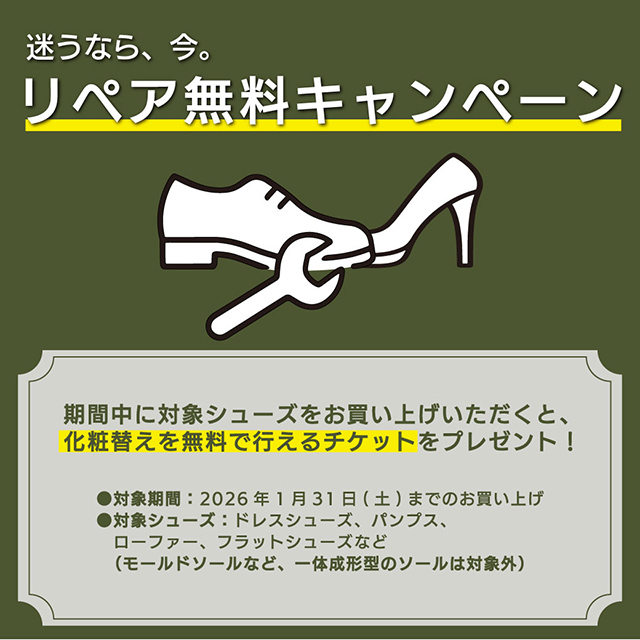 期間中、対象シューズお買上げで化粧(リフト)修理が初回無料になるチケットをプレゼント!